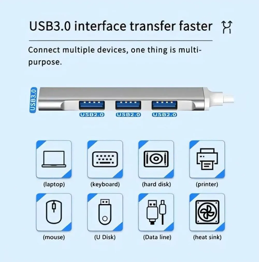 Hub USB desenvolvido para expansão de portas de conexão em dispositivos eletrônicos compatíveis com interface USB Tipo-C, permitindo a utilização simultânea de múltiplos periféricos.
